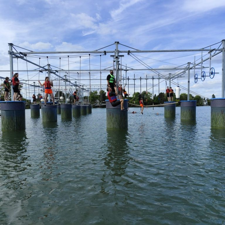Ein echtes Highlight ist der direkt angrenzende Kletterpark im Wasser, der in dieser Form nahezu einzigartig ist. Dieser kann in den Pausen aktiv genutzt werden und sorgt für Abwechslung sowie ein besonderes Erlebnis während der Schulung.
